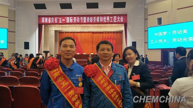 Wu Yuewu (L) and Ou Hongdao at the conference of Hunan Province for celebrating “May 1st” International Labor Day and commending model workers and excellent craftsmen